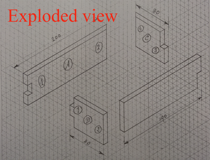 Ook kun je de onderdelen van een voorwerp een stukje van elkaar af tekenen alsof deze ontploft is. Op deze manier kun je heel duidelijk zien hoe de onderdelen eruit zien en hoe ze vast komen te zitten. Zo'n soort tekening noemen we een exploded view tekening. Deze wordt ook vaak toegepast bij bouwpakketten.