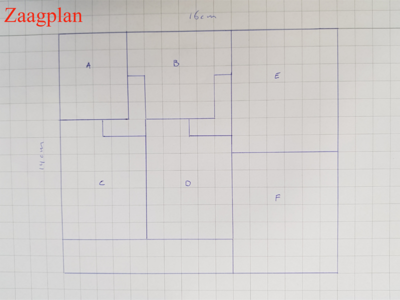 Een zaagplan is onmisbaar bij een goede voorbereiding. Je tekent hiervoor de onderdelen zo dicht mogelijk op elkaar zodat je zo min mogelijk afval hebt. Als je maar een bepaalde hoeveelheid hout tot je beschikking hebt teken je eerst een vak ten grootte van het materiaal om vervolgens binnen dit vak de onderdelen zo pas mogelijk te tekenen. Hiernaast zie je een voorbeeld van het zaagplan van de elektronische spaarpot.