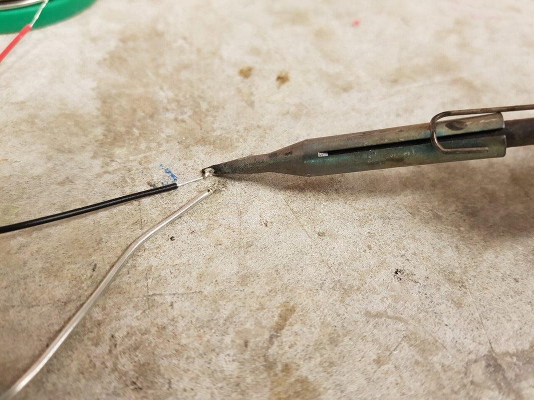 Stap 4: Vertin nu de uiteinden van alle draden. Dit doe je door met je ene hand de soldeerbout op het metalen uiteinde van het electra draad te houden en met je andere hand het soldeertin erbij te voegen. Let op dat je niet een te kort stukje soldeertin gebruikt dit vergroot de kans op een brandwond.