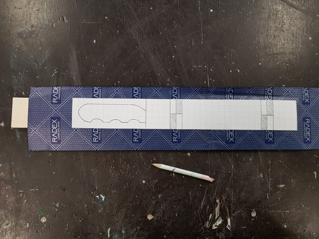 Stap 2: leg het carbonpapier op de lat met de print naar boven. Leg vervolgens het sjabloon erop en kontroleer of het op de lat zit. Trek de vorm vervolgens over met een podlood. Je zult zien dat de vorm doorgedrukt wordt op de lat.