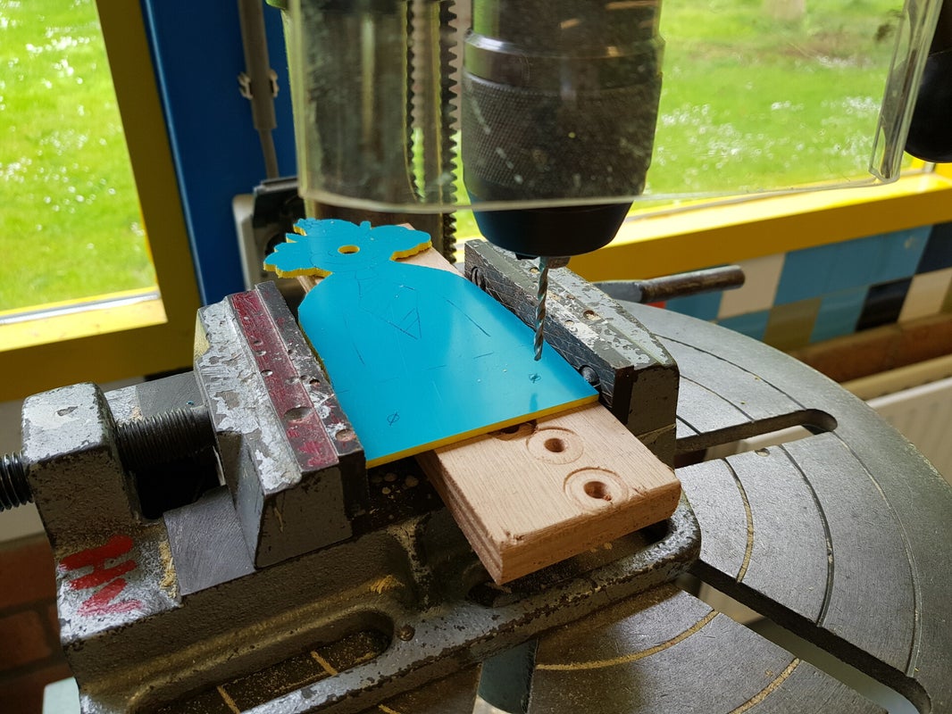 Stap 4: Leg een plankje smaller dan het forex in de machineklem leg hier vervolgens het forex bovenop en klem deze goed vast in de machine klem. Boor nu met een boor van 9mm een gaatje bij de neus van de clouwn.