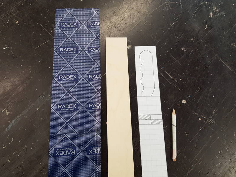 Stap 2: leg het carbonpapier op de lat met de print naar boven. Leg vervolgens het sjabloon erop en kontroleer of het op de lat zit. Trek de vorm vervolgens over met een podlood. Je zult zien dat de vorm doorgedrukt wordt op de lat.