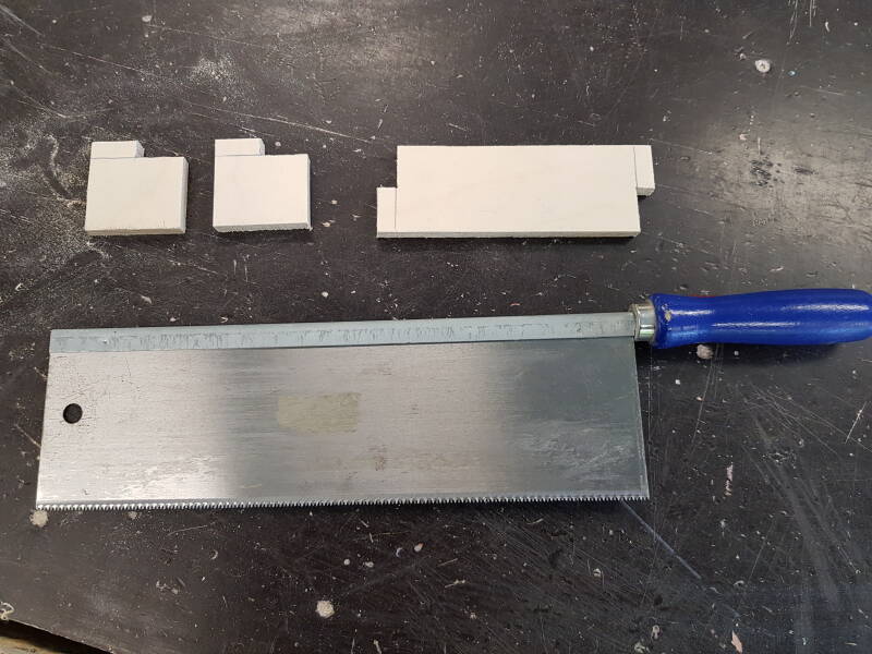 Stap 3: zaag de onderdelen op maat met een verstekzaag. Doe dit bij de lijn op 5cm, 20cm en 25cm.