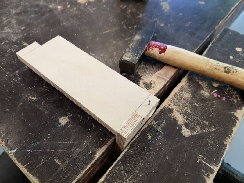 Stap 7: Smeer houtlijm op de vlakken die elkaar raken en sla alvast een spijker voor met een bankhamer.